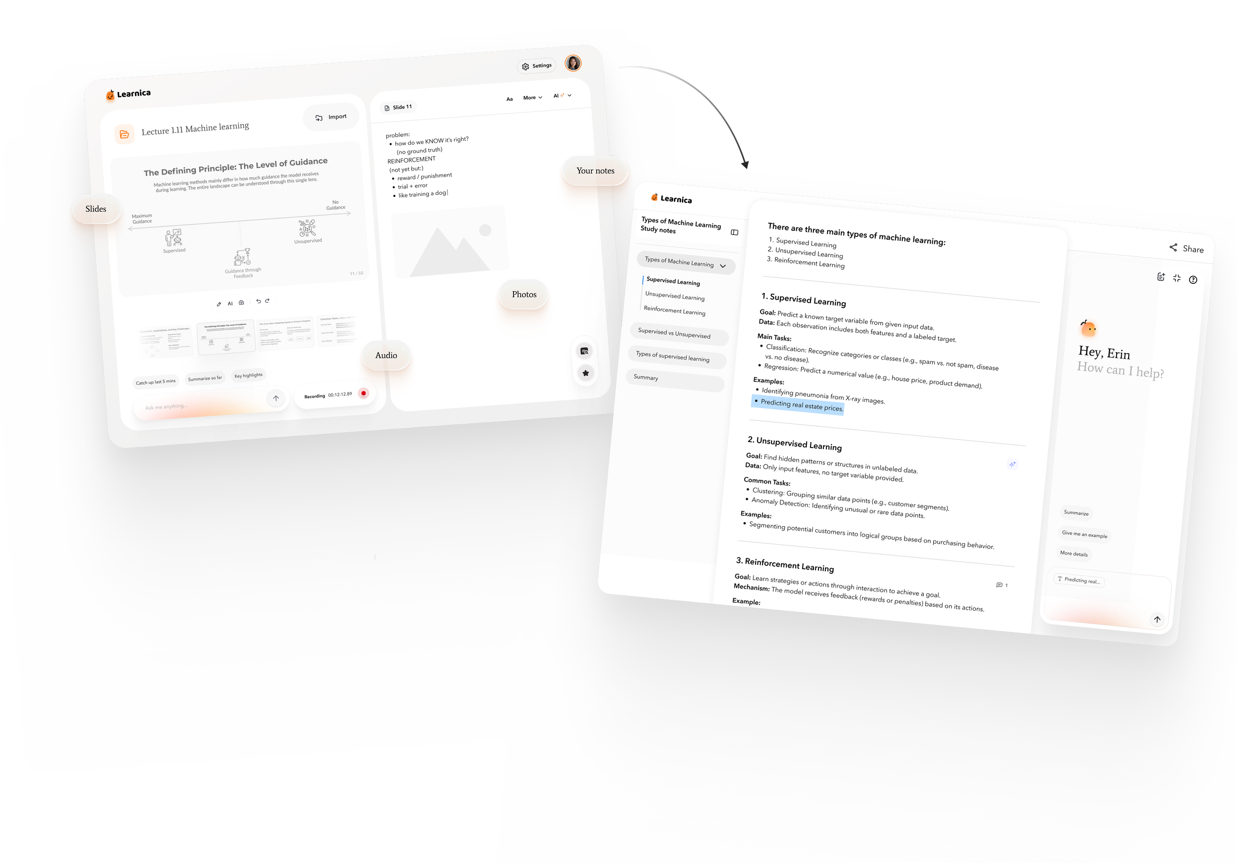 Audio, slides, and notes in one place. What matters, highlighted. What was confusing, explained.